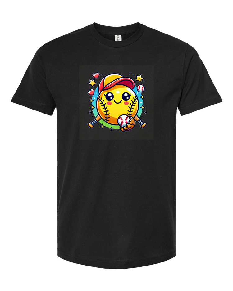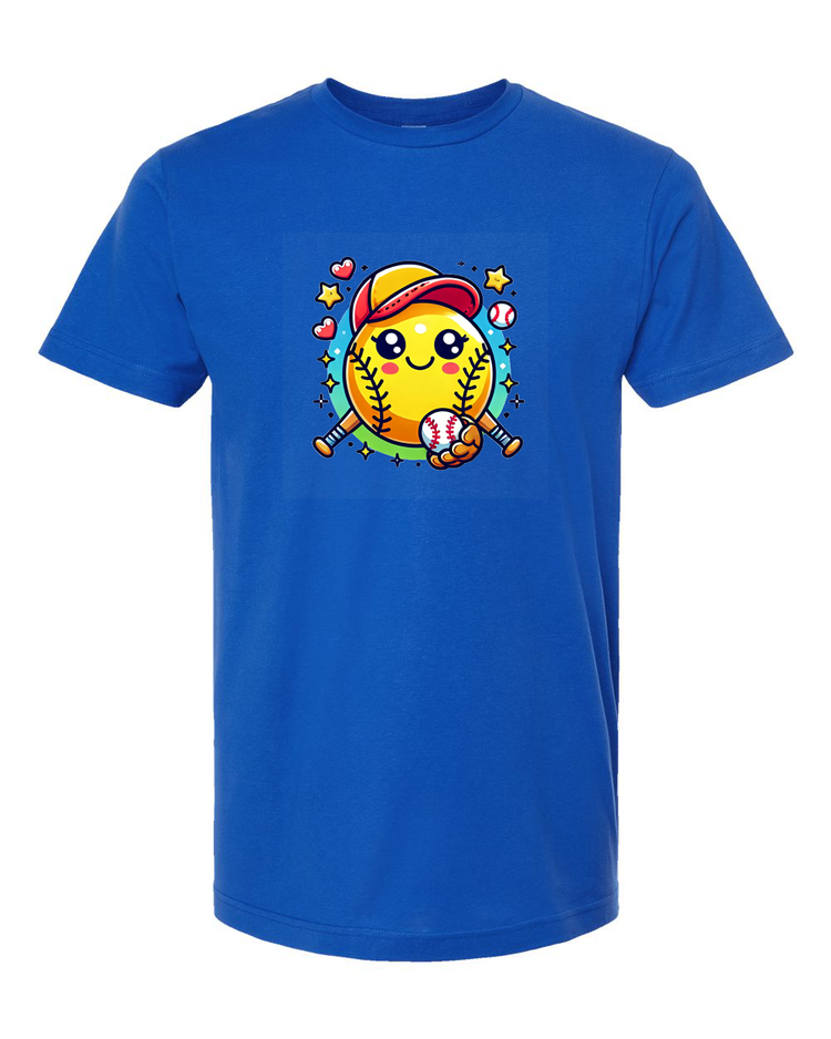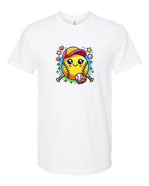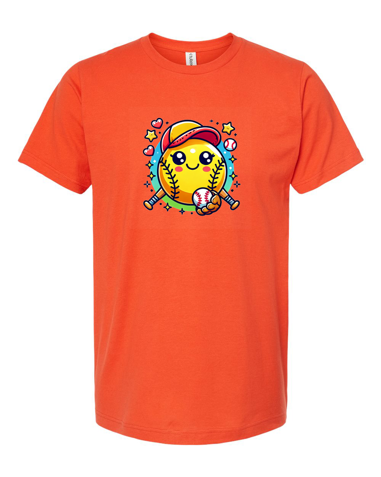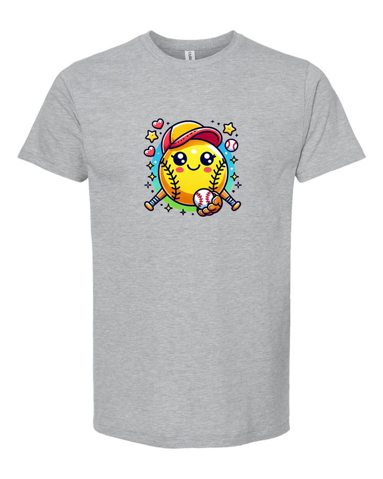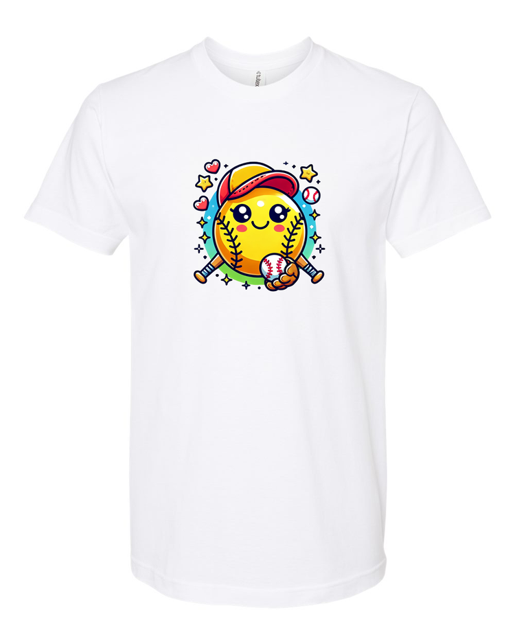 Step up your style game with this adorable softball emoji t-shirt! Featuring a cute and cheerful softball character with a baseball cap and bat, this tee is perfect for softball lovers of all ages. Whether you're on the field or cheering from the stands, this fun and playful design is sure to bring a smile to everyone’s face.